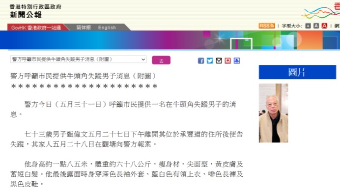 香港新聞網4月5日電 香港警方5日呼籲市民提供79歲失蹤男子何成安的消息。他4日上午在屯門大欖郊野公園麥理浩徑第10段最後露面後便告失蹤,其家人同日向警方報案。