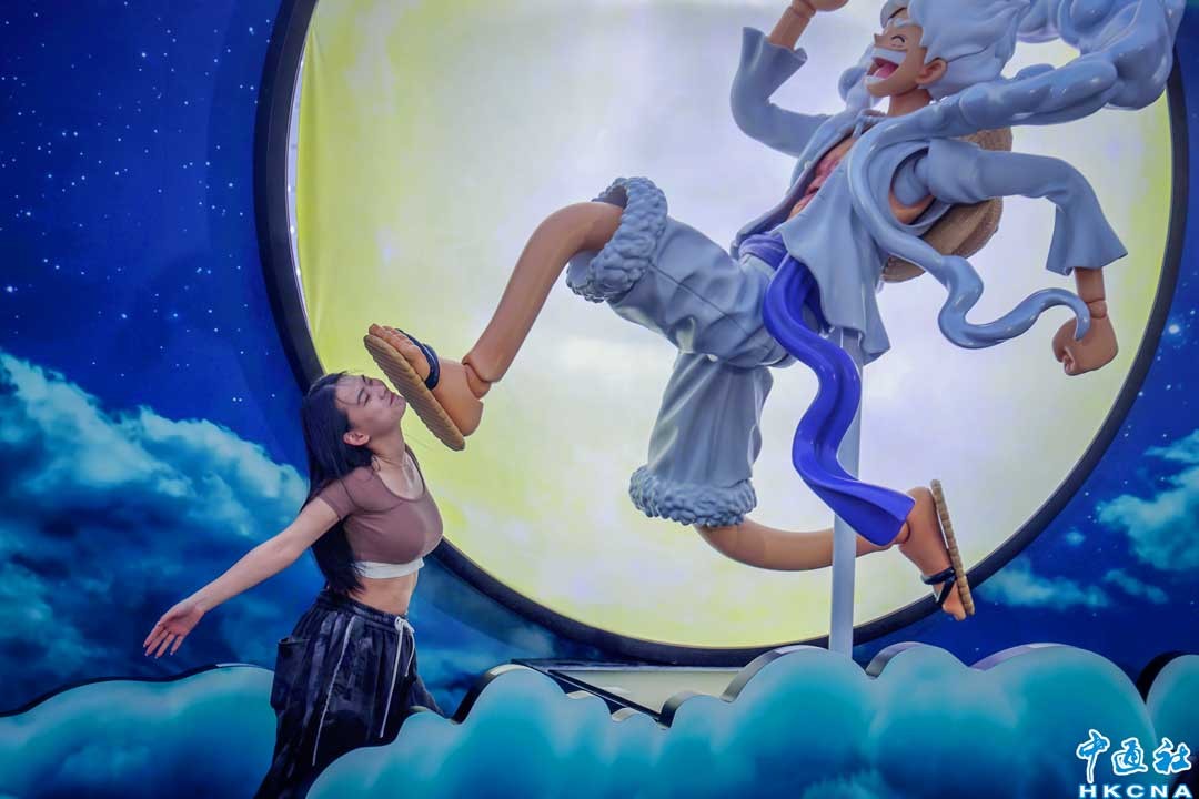 3月30日,香港市民在“海賊王”展區拍照打卡。由3月27日起至5月5日,香港海港城與Bandai Namco Asia合作推出“Bandai Namco Asia Journey in Hong Kong”大型主題活動,匯集《機動戰士高達》、《海賊王》、《塔麻歌子》、《超人》及《龍珠》五大經典動漫IP展區,於海運大廈不同位置重現多個經典場景,讓市民遊客能夠近距離感受各大作品的獨特魅力。(香港中通社記者 鄧梓傑 攝)