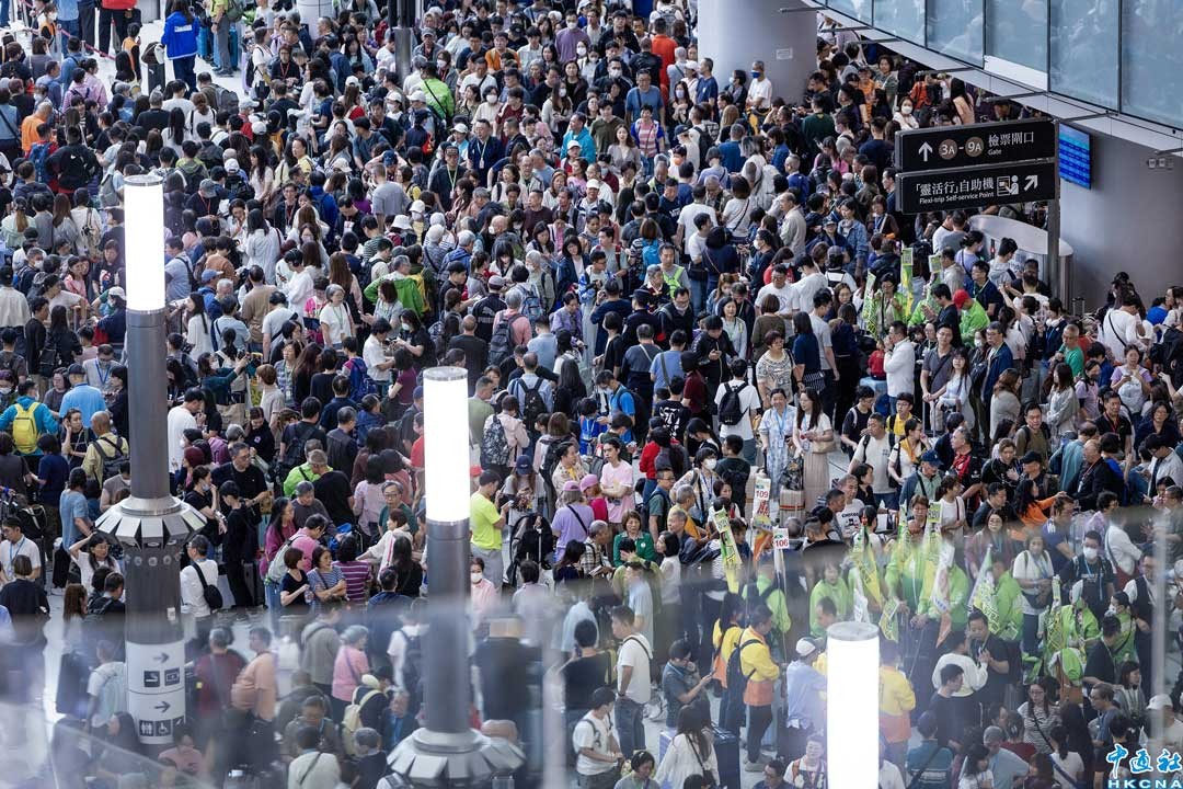 4月3日,清明復活節首日,離港的人流擠滿香港西九龍高鐵站。香港入境事務處預計,4月3日至7日復活節及清明節長假期間,香港各海、陸、空管制站總出入境人次約達644萬,其中約543萬人次將經陸路口岸通行。(香港中通社記者 陳奕啟 攝)