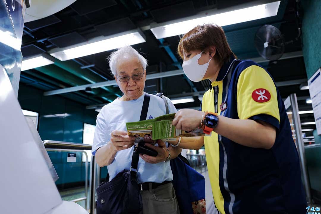 4月3日,香港政府長者及合資格殘疾人士公共交通票價優惠計劃(二元優惠計劃)今起由二元劃一收費調整為“兩蚊兩折”。圖為港鐵深水埗站,工作人員向有疑問長者講解調整收費情況。(香港中通社記者 陳奕啟 攝)