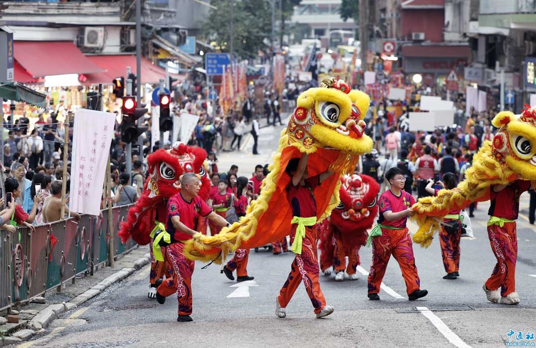 4月4日,香港紅磡舉行觀音誕巡遊。透過巡遊、民俗表演及盆菜宴等形式,弘揚觀音誕節慶文化,促進居民互動與文化傳承,展現地方特色,讓市民感受傳統文化魅力,增進鄰里情誼。圖為巡遊隊伍經過紅磡鬧市,吸引大批市民圍觀。(香港中通社記者 陳奕啟 攝)