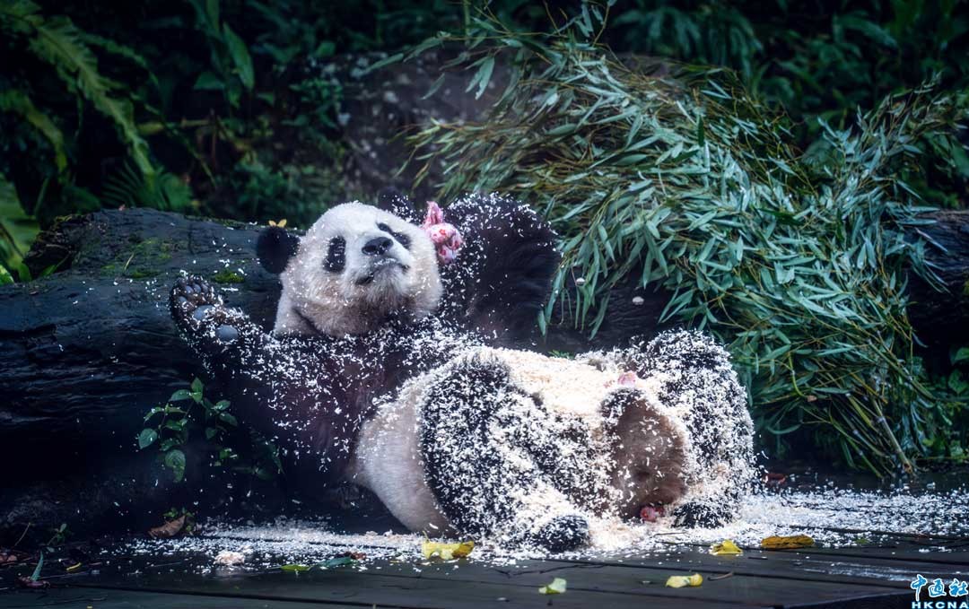 4月4日兒童節連假,台北市物園大熊貓“圓寶”收到保育員設計製造的行豐木屑包玩得不亦樂乎。 香港中通社圖片