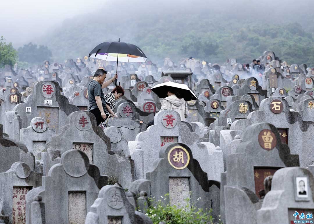 4月5日,清明節。香港鑽石山墳場,眾多市民帶同香燭祭品到場拜祭先人。(香港中通社記者 陳奕啟 攝)