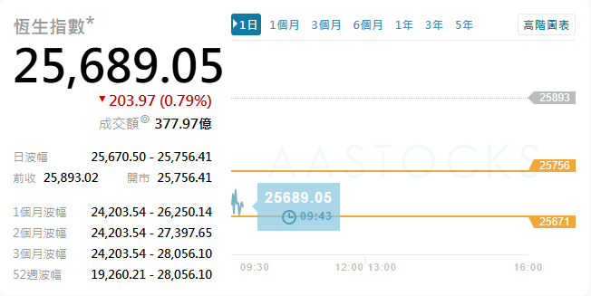 港股初段回吐 恆指低開0.53%