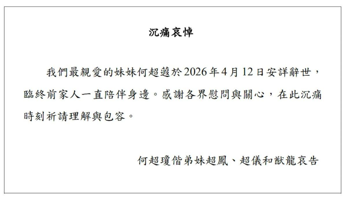 由何超蕸出任執行董事的信德集團,沉痛哀悼何超蕸逝世,並附上家人通告指:“我們最親愛的妹妹何超蕸於2026年4月12日安詳辭世,臨終前家人一直陪伴身邊。感謝各界慰問與關心,並指在此沉痛時刻祈請理解與包容。” 何超蕸生於1966年,是何鴻燊與二太太藍瓊纓的第三個女兒、信德集團行政主席兼董事總經理何超瓊胞妹。 何超蕸曾獲特區政府頒授銅紫荊星章及太平紳士等頭銜。她生前任信德集團有限公司執行董事,集團經營房地產發展、交通運輸、酒店及消閒和投資等業務。商界以外,她亦熱心社會服務,曾擔任東華三院董事局總理及董事局主席、平等機會委員會委員,以及公民教育委員會委員。 去年11月,何超蕸曾為她擔任創會會長的香港遼寧社團總會拍片,並呼籲市民踴躍在立法會換屆選舉投票。(完) 【編輯:張明臻】