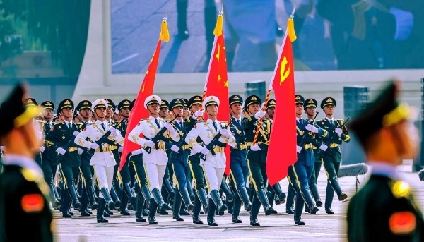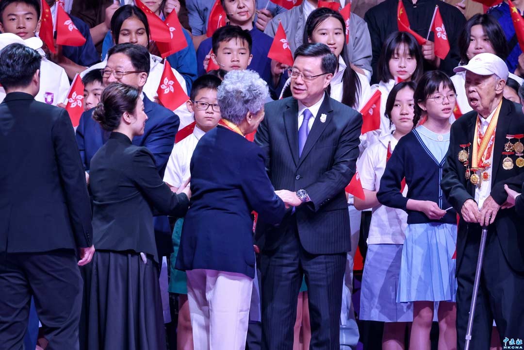 4月15日,“全民國家安全教育日”開幕典禮暨主題講座在香港會議展覽中心大會堂舉行。學生現場表演短劇《熱血東江 薪火相傳》,向東江縱隊老戰士致敬。圖為香港特區行政長官李家超等嘉賓向東江縱隊老戰士致敬。(香港中通社記者 謝光磊 攝)