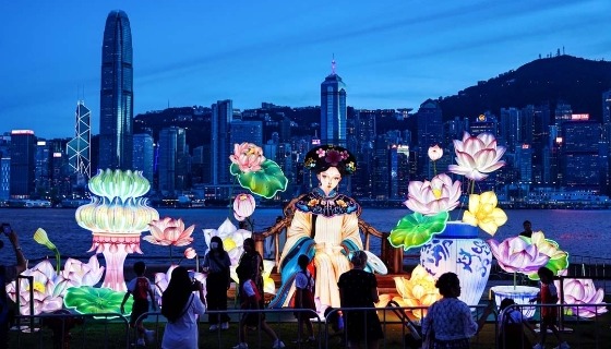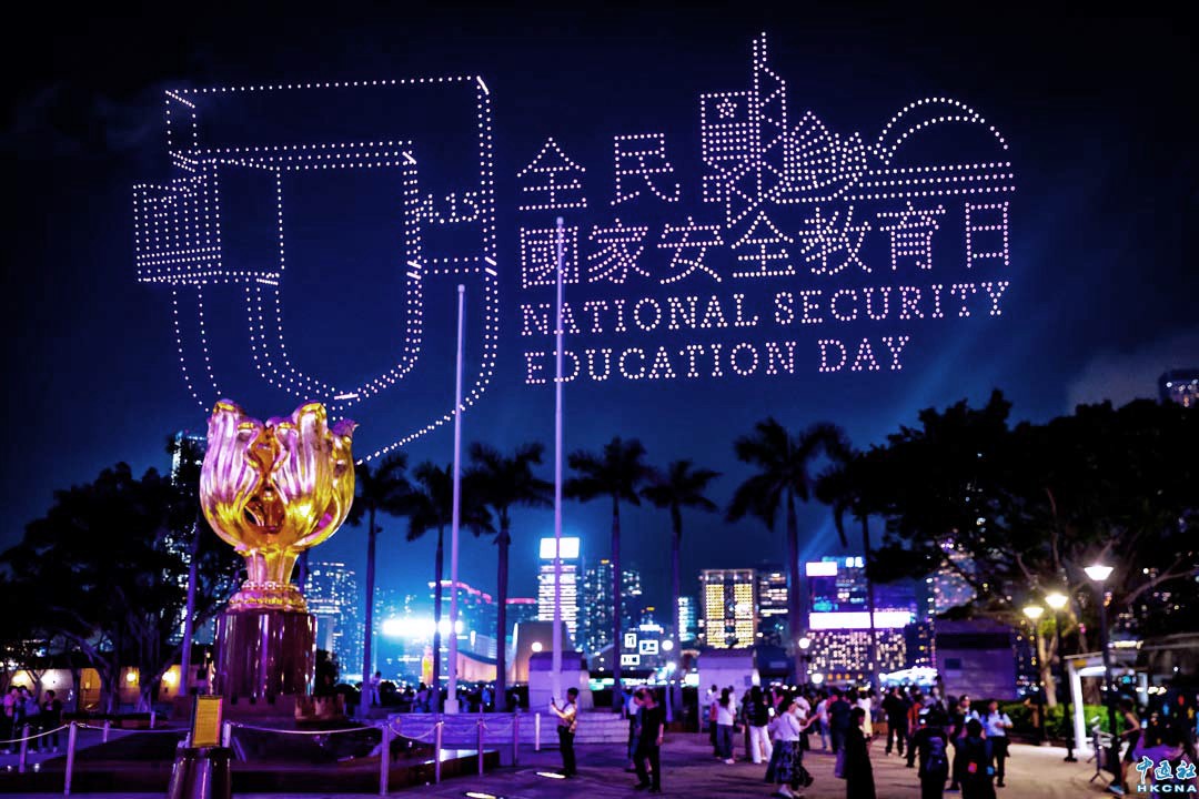 4月15日晚,紫荊文化集團在香港會展中心金紫荊廣場外舉辦2026“全民國家安全教育日”大型無人機表演。2026架無人機在維港騰空昇起,以動感光影藝術演繹香港青年學生國家安全主題創意作品,詮釋國家安全的豐富內涵, 營造全民參與共同維護國家安全的濃厚氛圍。(香港中通社記者 謝光磊 攝)