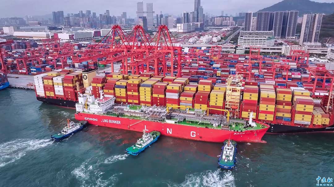 4月15日傍晚,全球最大的LNG運輸加註船“海洋石油301”輪緩緩靠泊深圳媽灣智慧港(MCT)4號泊位,開始為外輪“MSC SABRINA/地中海塞布麗娜”實施液化天然氣加註作業,這是“海洋石油301”輪在深圳西部港區的首次作業。“海洋石油301”輪總長184.7米、型寬28.1米,可裝載3萬立方米LNG,是中國自主設計、自主建造、自主管理、自主運營的第一艘LNG運輸船,也是當前全球最大的LNG運輸加註船。(陳軒穎 攝)