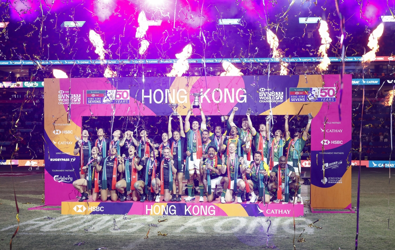 4月19日,香港國際七人欖球賽,男子組決賽南非隊以35:7擊敗阿根廷奪得冠軍。(香港中通社記者 陳奕啟 攝)