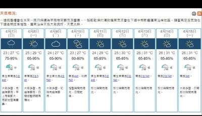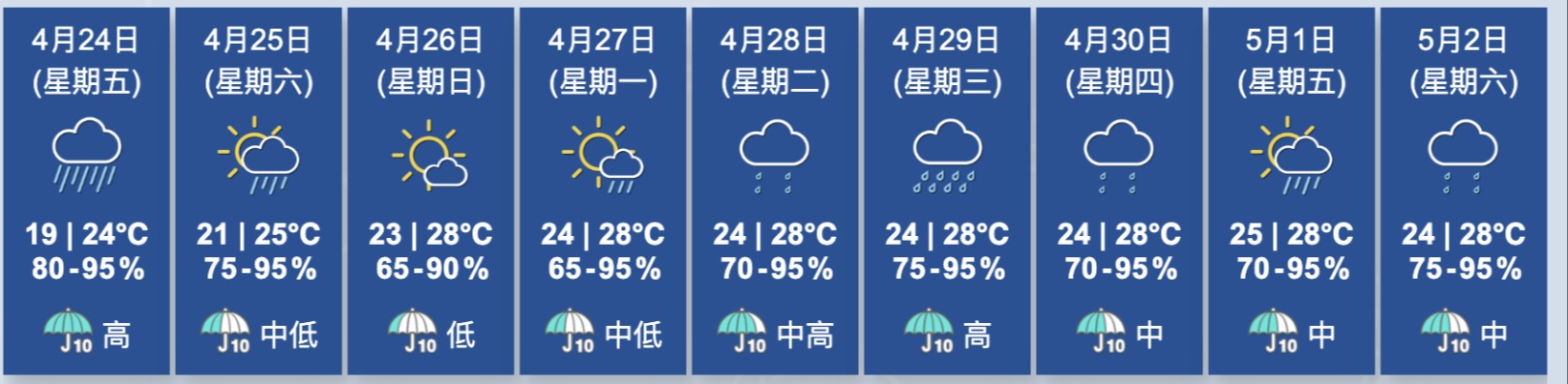香港地區大致多雲,有幾陣驟雨。驟雨逐漸增多及有幾陣狂風雷暴。氣溫逐步下降至午夜約23度。吹和緩至清勁偏北風,離岸間中吹強風。 23日雨勢有時頗大,天氣顯著較涼,氣溫下降至約19度。星期六早上仍然稍涼,驟雨減少。星期日部分時間有陽光。(完) 【編輯:陳卓儀】