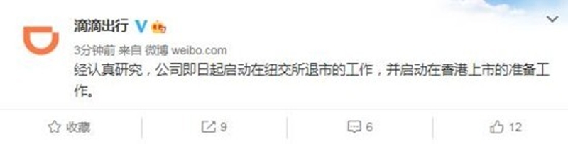 (滴滴出行微博截圖) 值得注意的是,滴滴出行上市至今,僅5個月時間。6月30日滴滴以每股14美元的發行價在紐交所掛牌,截至12月2日收盤,股價縮水近一半,市值蒸發約300億美元。 有分析認為,滴滴從美股退市緣於美國證監會公佈了《外國公司問責法》的最終規定,該法案要求外國公司提供審計底稿供美國檢查,否則可能3年內被勒令退市。這意味着:美國公开打壓中資企業,企業赴美上市日趨嚴格。 中概股在美股市場慘遭“血洗” 上週五相關中概股因此集體跳水,有市場分析員用了“血洗”二字來形容中概股的“一夜驚魂”,央視財經報導,納斯達克金龍中國指數暴跌9%,總市值蒸發近7000億元人民幣。 目前已上市的324只中概股中,有187只跌幅超過5%,愛奇藝、阿里巴巴、拼多多、京東、微博、嗶哩嗶哩、網易這些中國明星企業全線下跌。 這次的中概股暴跌不算偶發事件,由於監管變化等利空因素打壓,今年以來近4成中概股在美股跌破50%。 美國金瑞基金首席投資官布蘭登·埃亨在接受《每日經濟新聞》採訪時表示,“這將在美上市的中國公司以及美國和全球的投資者置入了一個進退兩難的境地。” 證監會:對中企境外上市持開放態度 由於滴滴出行此前正接受中國國家網信辦會同公安部、國家安全部、自然資源部、交通運輸部、稅務總局、市場監管總局等七個部門聯合開展的網絡安全審查。有個別媒體報導中國監管部門將禁止協議控制架構企業赴境外上市,推動在美上市中國企業退市。 證監會12月5日對此做了官方回應。“這完全是誤解誤讀。中國證監會對企業選擇境外上市地持開放態度,充分尊重企業依法合規自主選擇上市地。”美國打壓在美上市中國企業,脅迫中國企業退市,是一種“多輸”的做法。 據瞭解,二十多年來,已有二百多家中概股公司在美上市。中概股當初選擇赴美上市,意在高度發達的美國資本市場尋求外資。過往十年也的確是中國企業赴美的黃金時期,但隨著美國對中國企業打壓加劇,好日子已一去不復返。 落腳香港或是中概股更好選擇 業界相信,在美掛牌的中國公司考慮到被勒令退市的風險,為免公司股份交易陷入停頓或股價急挫,必定加快轉赴香港上市的步伐。 林文漢在接受香港商報採訪時表示,對有關中概股來說,在香港上市將可減低被政治打壓的經營風險, 香港與紐約同樣具備市場化、法治化、專業化優勢,沒有外匯管制下資金可自由流動,這對高速成長的中資企業是巨大的吸引力。 更為重要的是,香港擁有一個其他國際金融中心都無法媲美的優勢——接近中國內地這個增長最快的經濟體, 可近水樓台接觸內地投資者。 一家中資企業在美國上市,美國投資者只會覺得它是一個股票代號,但同一家企業在中國香港上市,內地投資者會更重視這家本國企業,更珍惜其所代表的成功故事和價值,這對企業進一步釋放增長潛力,有著重要作用。 港交所張開懷抱降低二次上市門檻 在美上市的中概股轉赴香港,近年蔚然成風,除了因為美國持續打壓中企,也因為香港交易所作出適切改革,成功吸引許多內地企業。 港交所曾在2018年落實重大改革,容許部分以大中華為業務重心的公司在港二次上市。改革後小米、美團、阿裡巴巴、京東、網易、百度、嗶哩嗶哩、中通快遞、攜程、華住、新東方等在內的多隻中概股已經完成了在港的二次上市,壯大了香港資本市場。 一位深圳公募基金人士坦言:“港股因上市條件靈活、運作效率高的特點,會迎來一波集中回歸。這個趨勢只會加速。” 預計其他中概股將陸續在未來3年內回歸港交所。港交所也將對二次上市企業門檻進行調整,上述美股股權將可以轉換為港股交易,作為一種兜底方案。 有分析師預計中概股回港上市的風潮將從此前的大型科網巨頭為主,逐步擴散至中小市值的公司,且上市公司的行業分佈將進一步多元化。 隨著中美關係持續低迷,展望未來,西方不亮東方亮,香港一定會有更雄厚的資本市場,作為國際金融中心翻開新的篇章。 【編輯:王軼南】