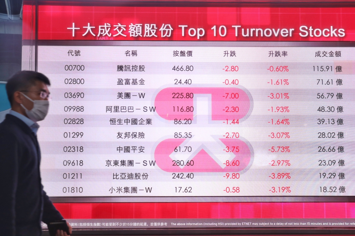 香港中通社圖片 當日,港股先低開404點或1.6%,報24251點,早段跌幅擴逾500點,臨近收市沽壓激增,跌幅一度擴大逾600點,險守24000點,低見24001點。大市全日成交1464.86億港元。 國企指數收報8503點,跌154點或1.79%;恆生科技指數收報5552點,跌150點或2.65%。 藍籌股普遍下跌,科網股拖累大市。持續獲北水淨入的美團跌3%,阿里巴巴跌1.9%,京東集團跌2.9%,百度集團和嗶哩嗶哩各跌4.3%和5.7%。 互聯網醫療股亦受壓,京東健康跌5.6%,阿里健康跌7%,是跌幅最大藍籌股。 教育股集體大跌,希望教育急挫17.5%,新高教集團挫15.1%,中國東方教育插10.6%,新東方跌8.1%。 國家商務部要促進新能源車消費,但汽車股仍普遍下跌。小鵬汽車及理想汽車各跌6.7%及5.3%,吉利汽車和比亞迪各跌3.9%至4.4%。 香港證券商第一上海首席策略分析師葉尚志表示,美聯儲即將議息前夕,加上俄羅斯和烏克蘭的局勢依然緊張,全球股市顯著震盪。但目前來看,港股已經建立起來的升市結構未受到嚴重破壞。 葉尚志認為,本周會是關鍵窗口,如果港股能夠安然過渡,相信穩中向好發展模式可保持完好,有機會進一步向上挑戰。(記者 李明珠) 【編輯:陈卓仪】
