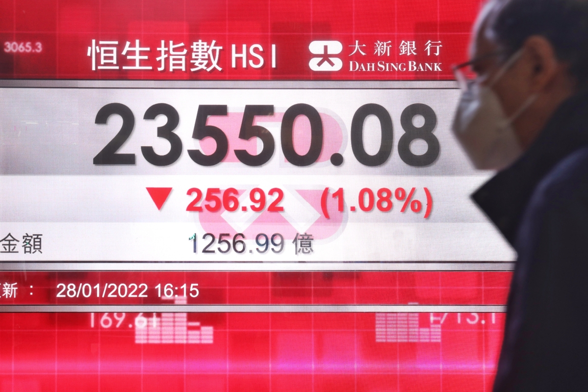 香港中通社1月28日電 香港股市28日持續轉弱,恆生指數收市跌256點或1.08%,收報23550點。以周為計,累計跌1415點或5.7%,終止連升五周的走勢。