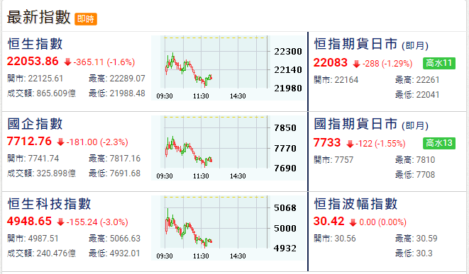 香港新聞網6月29日電 29日為港股期結日,大市低開293點後反覆向下,曾跌逾400點失守22000點。恒生指數半日跌365點,報22053點,成交865.6億港元。
