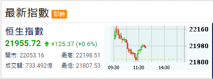 當日,港股高開222點,開報22053點,重上22000點關口,升幅一度擴大至300點,其後一度轉跌。