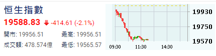 【港股半日速報】恆指半日跌414點
