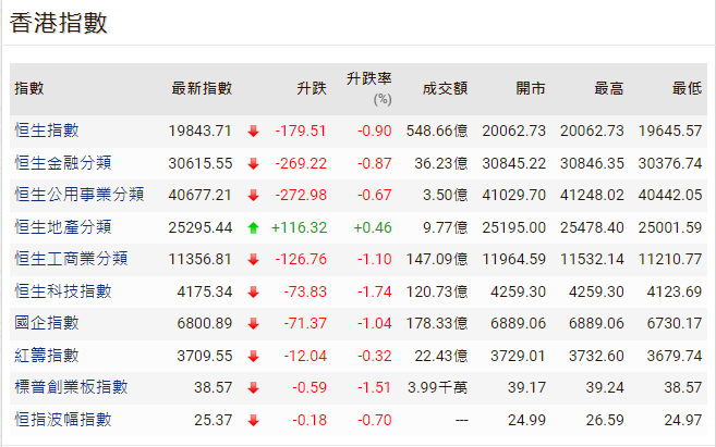 香港新聞網8月30日電 美股隔晚續向下,港股期指結算日靠穩高開39點,開市後隨即轉跌,一度跌逾300點。恒生指數30日午間收市報19843點,跌179點或0.9%。