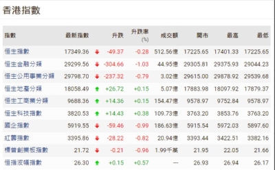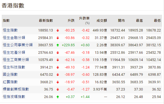 香港新聞網9月15日電  加息憂慮揮之不去,世銀警告全球陷滯脹,美股下跌,港股跟跌。恒指半日跌80點或0.4%,報18850點,成交449.9億港元。