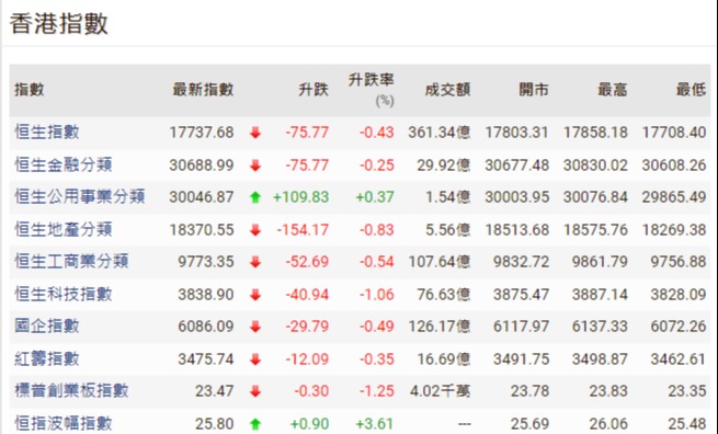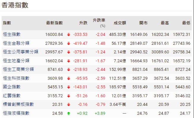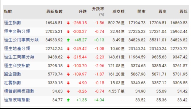 當日,恆生指數低開363點或1.97%,報18080,跌穿今年3月15日低位,創出2012年6月4日以來新低。