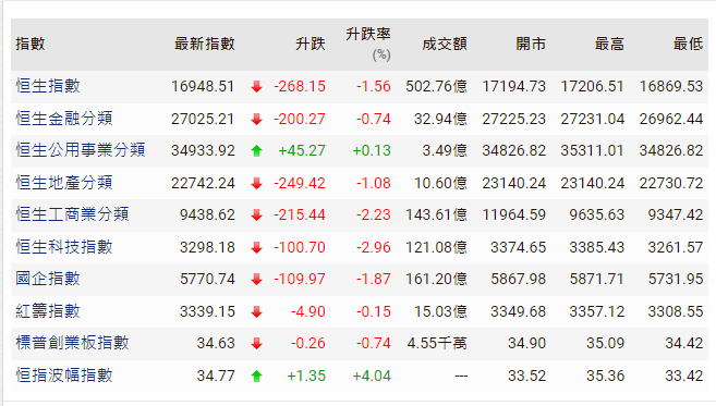 香港新聞網10月11日電  美股反覆受壓,港股半日再跌逾200點,跌穿17000點。恒生指數半日再跌268點,報16948點,跌穿17000點,成交502.8億港元。