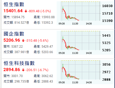 恆生科技指數半日插206點或6.66%,報2894點;國企指數插310點或5.63%,報5206點。 73隻藍籌股中僅6隻錄得升幅,多隻藍籌股創新低,科網股、內房及物管股受沽壓。