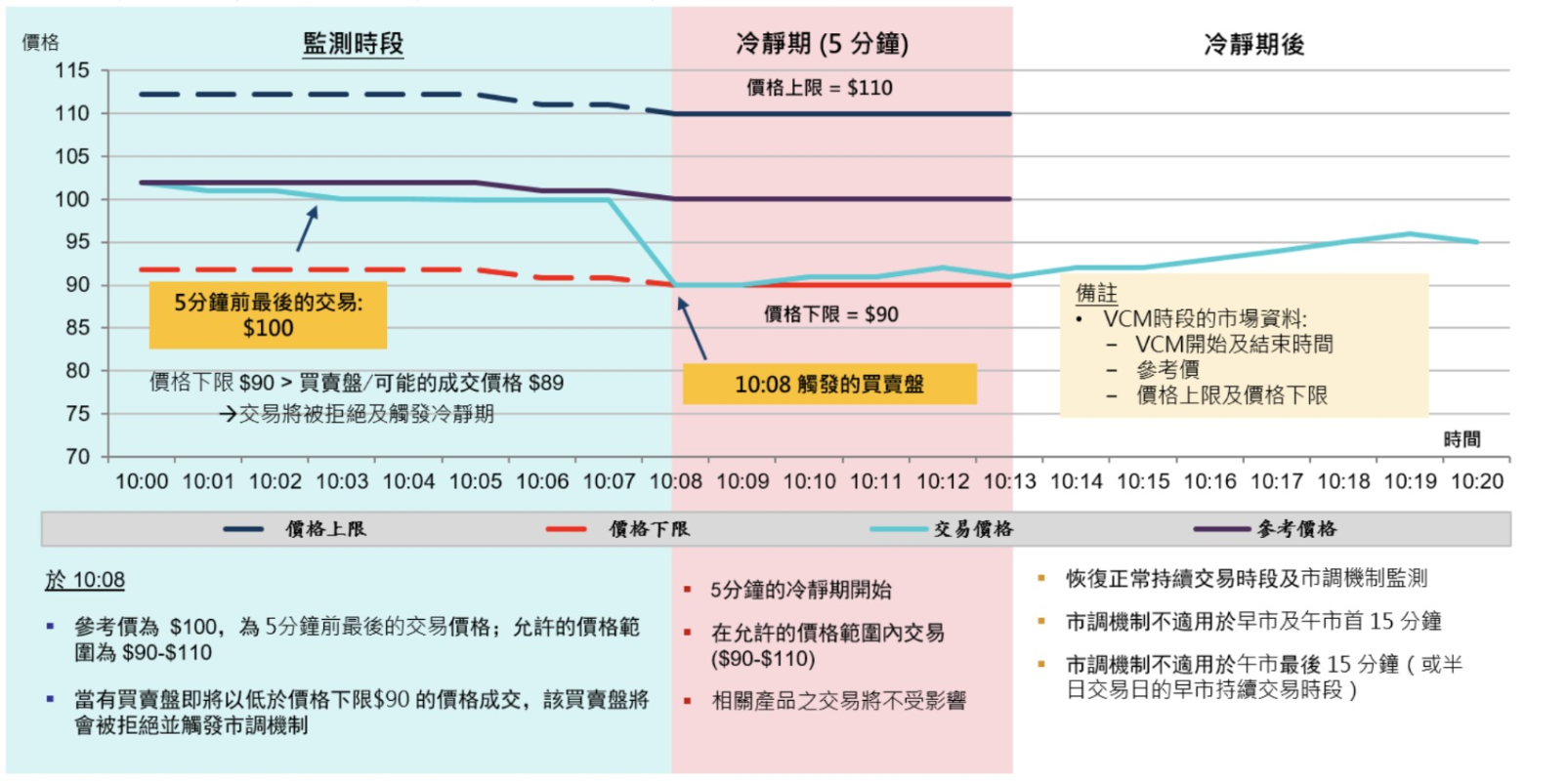 香港新聞網10月27日電 昨日(26日)港交所(00388.HK)旗下的香港期貨交易有限公司(期交所)發佈,因外部供應商軟件問題,期交所暫停恒生指數期貨、指數期貨、恒生科技指數期貨、小型恒生指數期貨、小型指數期貨現月合約及下月合約的市場波動調節機制,直至另行通知。簡單來說,這個消息的發佈意味著恒生指數期貨產品5分鐘的正負10%保護機制停了。 港交所的市場波動調節機制已實施多年,2016年8月22日開始施行。是指當股票(期貨合約)的價格相對於5分鐘前的最後交易價變動幅度超過±10%,市場啟動的5分鐘冷靜期,此時交易將限於制定價格範圍內繼續進行,正常交易將於其後重啟。此機制不會暫停交易,并非用來限制股價上落,也與某些市場就交易限定每日價格範圍的每日漲跌停板制有所分別。 市調機制的設計已包括特別措施以盡量減少干擾市場。例如它適用於個別的產品而非整個市場;建議采納動態而非靜態的參考價;觸發點設置的門檻應不致過頻地觸發市調機制(市場的觸發點因應股票組別分別設為±10% 、±15%或±20%);港股的市調機制監測適用於持續交易時段,除了早市與午市的前15分鐘,以及午市(或半日交易日的早市持續交易時段)的最後20分鐘。 港交所的市調機制是價格在一個特定的時間內偏離超過預定的百分比,便會觸發一個五分鐘的冷靜期,以便在有需要的情況下,提供一個時段讓市場參與者重新審視他們的策略。這也有助於在市場波動的情況下重新建立有序的市場。 在此模式下,個別產品價格如出現劇烈波動便會觸發冷靜期。下圖說明適用產品觸發市調機制的運作,并以±10%為觸發門檻及冷靜期內的價格限制為例。