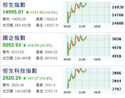科技股造好,騰訊控股升4.4%,美團升4.9%,阿里巴巴升逾3%。(完)