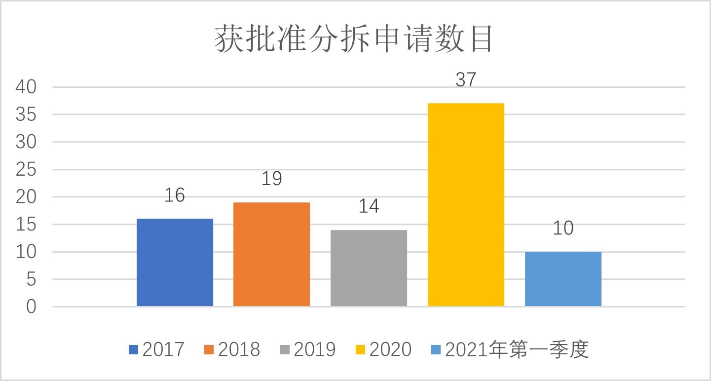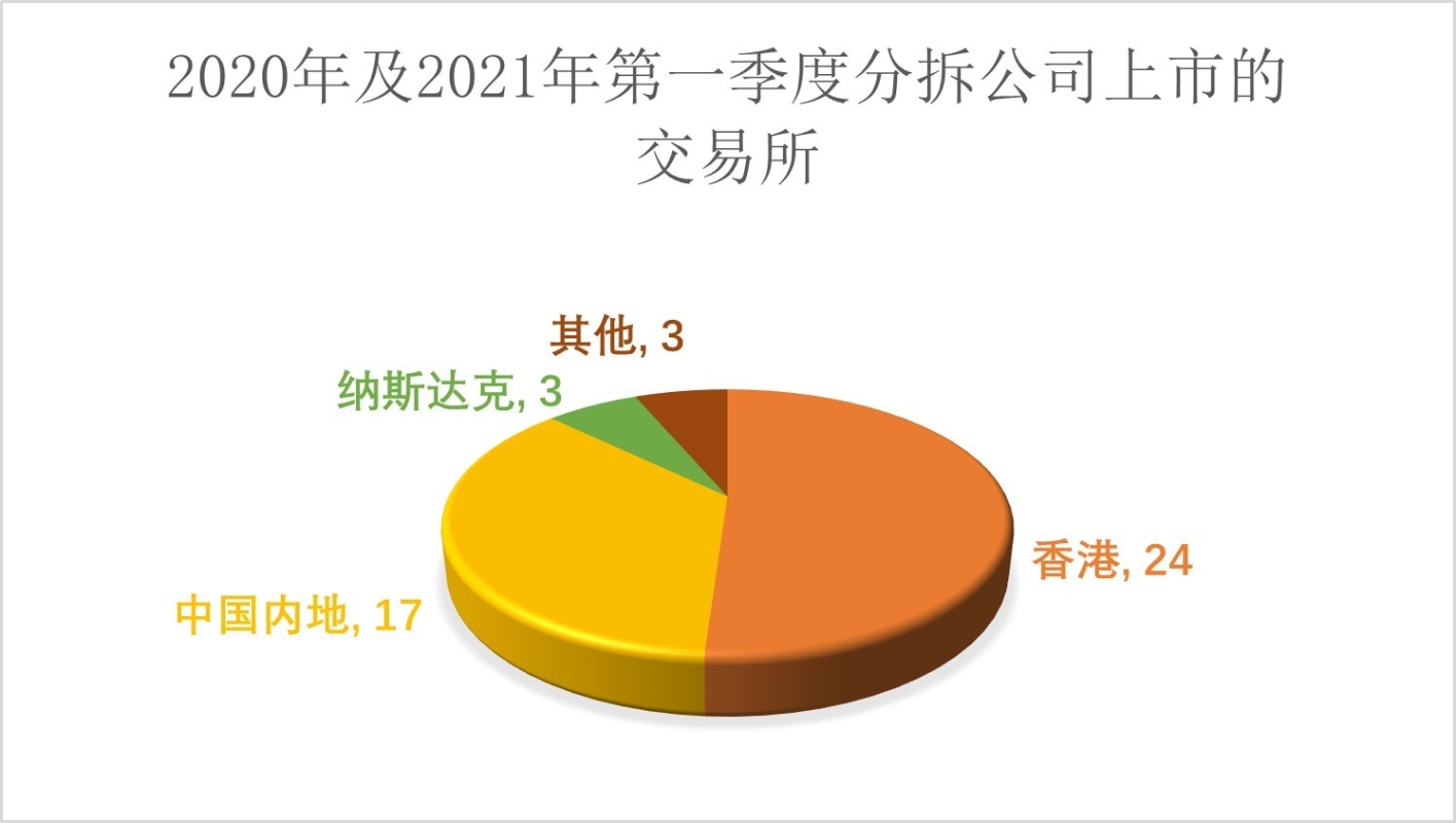 2017至2021年第一季度香港上市公司獲批准分拆申請的數目 資料來源:網絡公開數據 據中倫律師事務所的介紹,香港上市公司想要將其上市集團內的部分資產或業務剝離出來作獨立上市,都必須按照《上市規則》《第15項應用指引》(“PN15”)的規定向聯交所提交分拆上市的書面申請,並獲得聯交所的批准。按照PN15規定的原則和要求,上市公司在準備PN15申請時,應確保至少包含以下內容:分拆背景、保留業務滿足聯交所上市的要求、分拆公司滿足聯交所上市的要求(如果分拆公司擬於聯交所上市)、獨立性問題、明確商業利益及對保證配額的具體安排等。 港股上市公司分拆上市緣由 一般來說,分拆上市之下,子公司或附屬公司會獨立出來,可以進行單獨融資,也有利於對子公司或附屬公司資產進行單獨定價。在經營層面,分拆上市利於推動子公司獨立經營,讓權責更為明確。 對於港股公司來說,分拆上市一般也有此類目的。