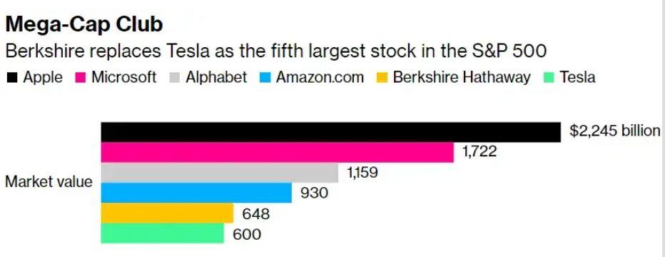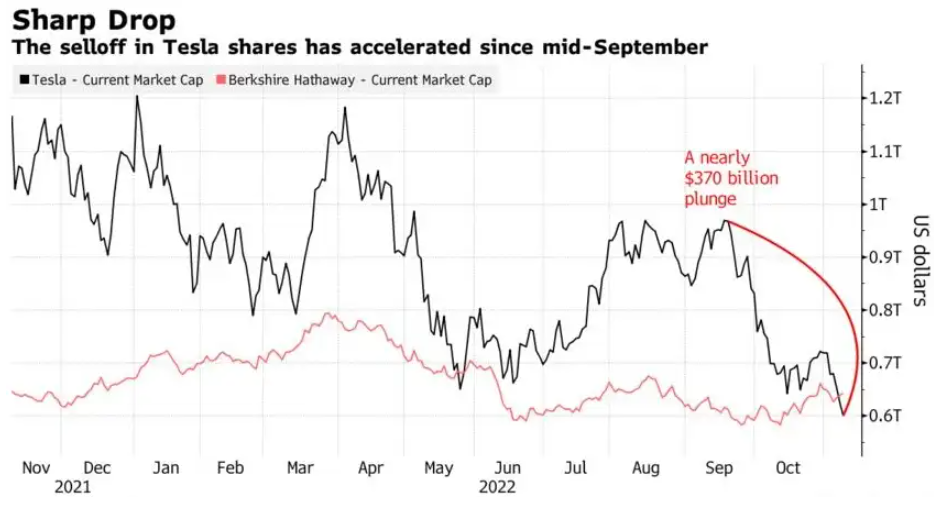 自 9 月中旬以來市場對特斯拉的拋售加速 B. Riley Wealth首席市場策略師Arthur Hogan稱:“這很好地體現了在當前環境下,緩慢而穩定的市場贏得了競爭。在過去十年的大部分時間裡,價值型股的增長表現都落後於成長型,但今年趨勢肯定發生了變化,很可能會持續到明年。” 投資者擔心馬斯克這位特斯拉 CEO 和最大股東把越來越多的精力都放在了推特身上。隨著投資者紛紛拋售特斯拉公司的股票,馬斯克的個人財富在周二跌破了2000億美元。據報道,由於特斯拉股價下跌,馬斯克目前的淨資產為1948億美元,其中很大一部分來自他在特斯拉近15%的股份,特斯拉的市值為6220億美元。 特斯拉市值跌出1萬億美元 在經歷了3600億美元市值的蒸發後,特斯拉的位置剛剛被沃倫•巴菲特旗下的老牌經濟巨頭取代,伯克希爾哈撒韋成為標普500指數中的市值第五大公司,特斯拉退居第六名。這家由埃隆•馬斯克領導的電動汽車製造商周二收盤時的市值為6040億美元,而伯克希爾哈撒韋的市值為近6450億美元。 這突顯出今年的巨大經濟動蕩:曾經高歌猛進的科技股再度暴跌,而工業企業的表現則優於其他企業。自從馬斯克在今年4月份開始尋求收購推特以來,特斯拉市值蒸發了接近一半;馬斯克淨資產較一年前的3400億美元峯值下滑了48%。