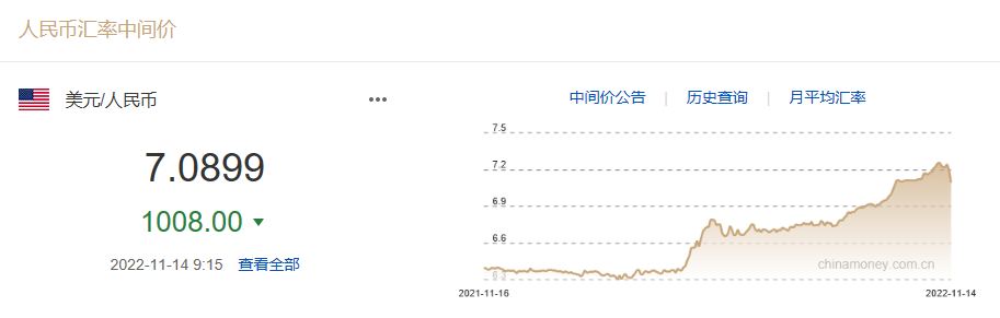 香港新聞網11月14日電 離岸人民幣兌美元今日收復7.03關口,人民幣中間價大漲1008點,單日升幅創17年紀錄。今日早間,中國人民銀行授權中國外匯交易中心公佈,人民幣兌美元中間價報7.0899,上調1008點,升幅創2005年7月22日以來最大;上一交易日中間價7.1907,上一交易日官方收盤價7.1106,上日夜盤報收7.0935。