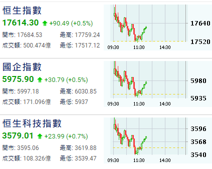 香港新聞網11月24日電 香港恆生指數24日中午收市升90點或0.52%,報17614點。
