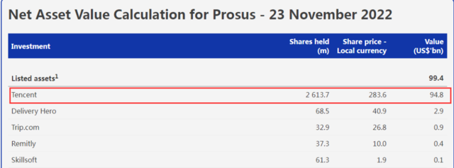 荷蘭子公司Prosus的資產淨值報表 圖源:Prosus官網 此前,在9月9日至10月28日的一個多月裡,南非Naspers集團曾暫停減持騰訊股票,期間騰訊股價仍跌超30%,至2017年初以來最低。截至本周四(24日)港股收盤,騰訊股價已較10月28日的階段低位反彈近40%。 11月24日,騰訊H股收於280.4港元/股,下跌0.57%,總市值2.69萬億港元,較10月28日的階段低位反彈近40%。
