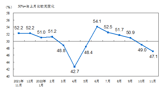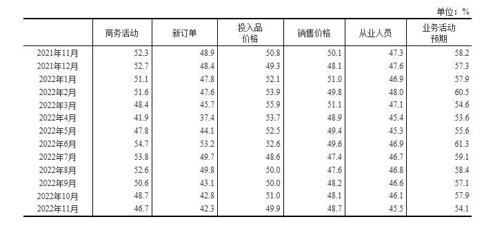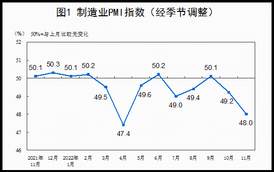 圖源:國家統計局網站公佈資料 根據國家統計局網站數據顯示,中國製造業采購經理指數運行情況在11月份有所下降,製造業采購經理指數(PMI)為48.0%,比上月下降1.2個百分點,低於臨界點,製造業生產經營景氣水平較上月有所下降。WW 生產指數為47.8%,比上月下降1.8個百分點,表明製造業生產活動繼續放緩。新訂單指數為46.4%,比上月下降1.7個百分點,表明製造業市場需求持續回落。原材料庫存指數為46.7%,比上月下降1.0個百分點,表明製造業主要原材料庫存量有所減少。從業人員指數為47.4%,比上月下降0.9個百分點,表明製造業企業用工景氣度下降。供應商配送時間指數為46.7%,比上月下降0.4個百分點,表明製造業原材料供應商交貨時間有所放慢。 中國非製造業采購經理指數運行情況:11月份,非製造業商務活動指數為46.7%,比上月下降2.0個百分點,低於臨界點,非製造業景氣水平有所回落。