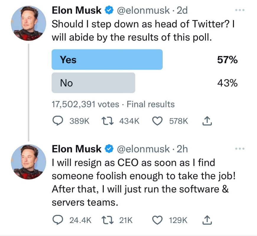 剛剛!" 分心 "推特的馬斯克宣佈辭任CEO,正物色接班人香港新聞網12月21日電 當地時間12月21日,埃隆·馬斯克在推特發文宣佈,在找到接替人選之後,將辭去推特首席執行官職務,但仍會負責管理推特軟件和服務器團隊。此前,馬斯克曾就是否應辭去推特CEO一職在推特發佈民意調查,該調查顯示,57.5%的用戶投票讚成他辭職。