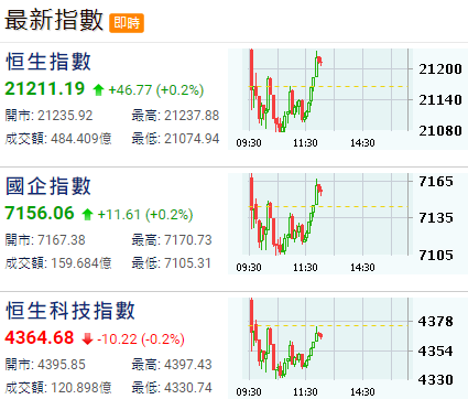 當日,港股先高開71點,其後轉跌最多89點,低見21074點,中午收市前回升。