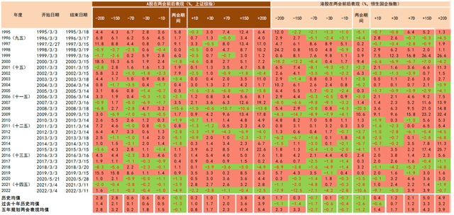 資料來源:發改委,財政部,央行,證監會,銀保監會,住建部,國資委,工信部,中金公司研究部 圖表3:從1995-2022兩會前後市場表現:A股和港股在兩會前後往往有相對不錯的表現,但今年兩會前後市場表現可能相對平穩