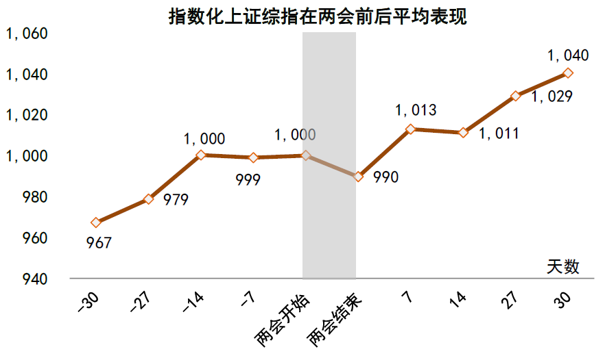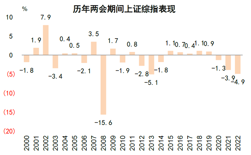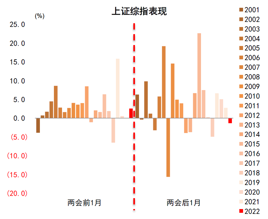 資料來源:Wind,中金公司研究部 圖表5:2000年至今上證綜指在兩會前後漲多跌少(上)和上證綜指在兩會期間互有漲跌(下)