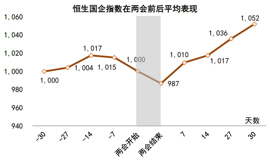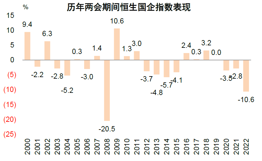 資料來源:Wind,中金公司研究部 圖表7:2000年至今恒生國企指數在兩會後表現較好(上)和恒生國企指數在兩會期間各有漲跌(下)