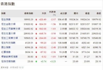 【港股半日速報】恆指半日跌131點
