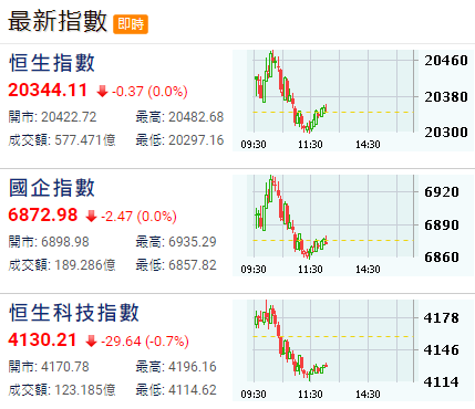 香港新聞網4月14日電 香港恆生指數14日半日跌不足1點,報20344點,成交577.47億港元。
