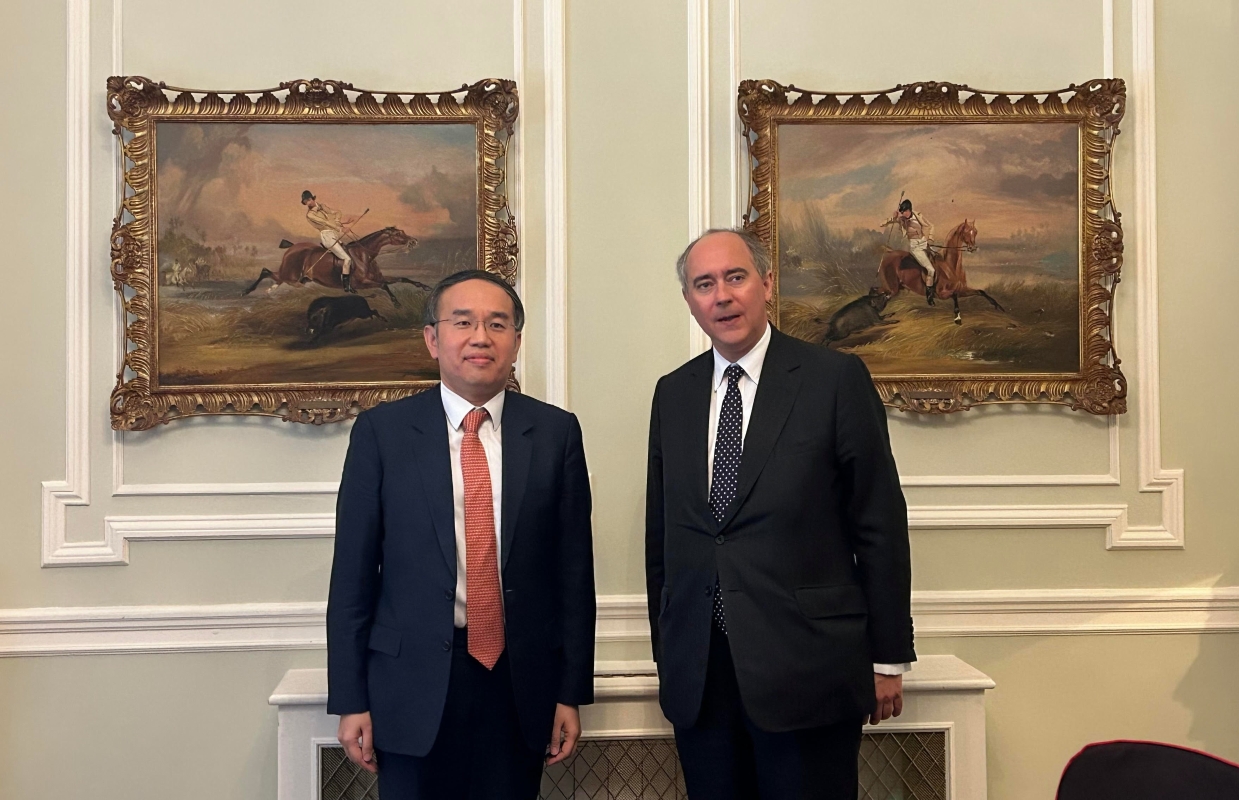 許正宇(左)於英國倫敦會見商業及貿易部國務大臣莊敦文勳爵(右)。 許正宇也向英國獨立智庫“亞洲之家”詳細介紹香港的綠色和可持續金融發展。他說,為了實現在2035年前減少碳排放50%,並在2050年前實現碳中和的目標,香港政府一直透過多管齊下的策略與金融監管機構和業界協同合作。