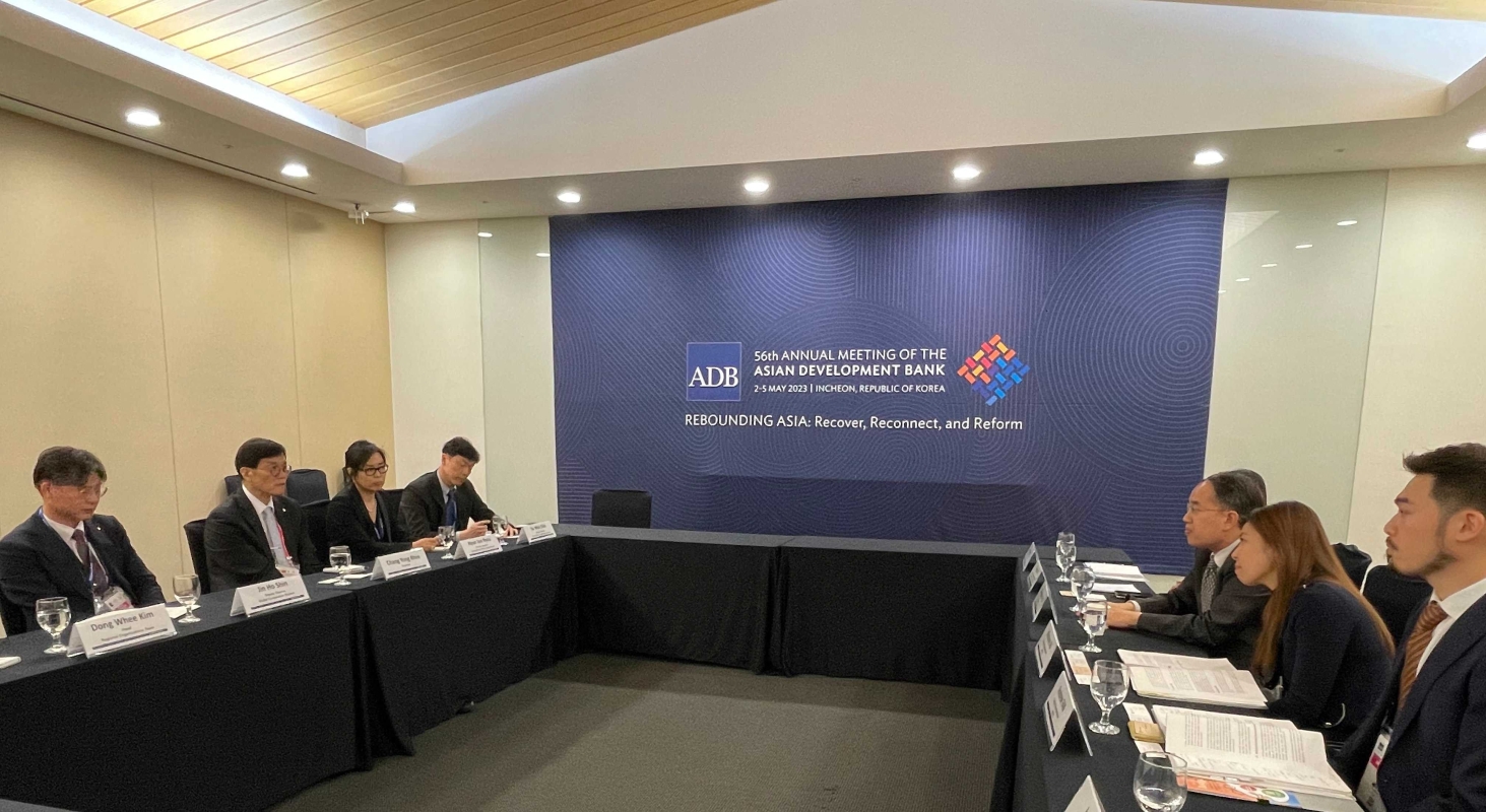 圖片來源:政府新聞網。圖示許正宇(右三)與韓國銀行總裁李昌鏞(左二)會面。 許正宇在亞行年會的組別會議上分享了香港在綠色金融及減碳方面的工作,指出香港作為國際金融中心,已發展成為區內領先的綠色和可持續金融樞紐,並可為亞行促進金融資源投放和填補區內基礎設施融資缺口作出貢獻。