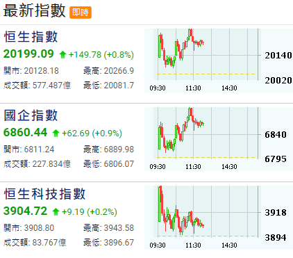 香港新聞網5月8日電 美股上周五造好,香港股市8日亦高開,恆生指數中午收市升149點或0.75%,報20199點,成交577億港元。