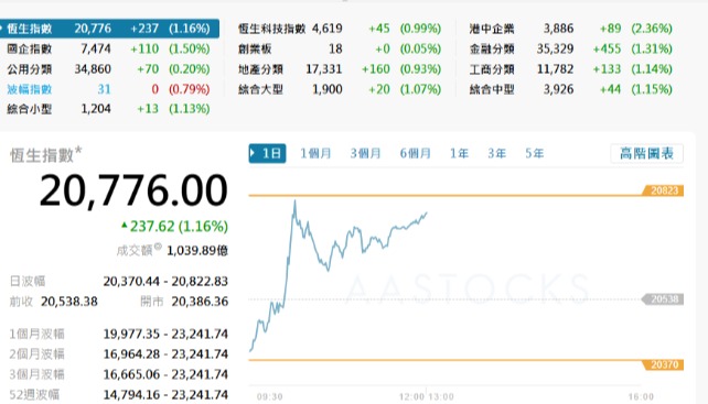 當日,恒指低開17點,其後走勢反覆向好。科指升0.9%,報4091點。