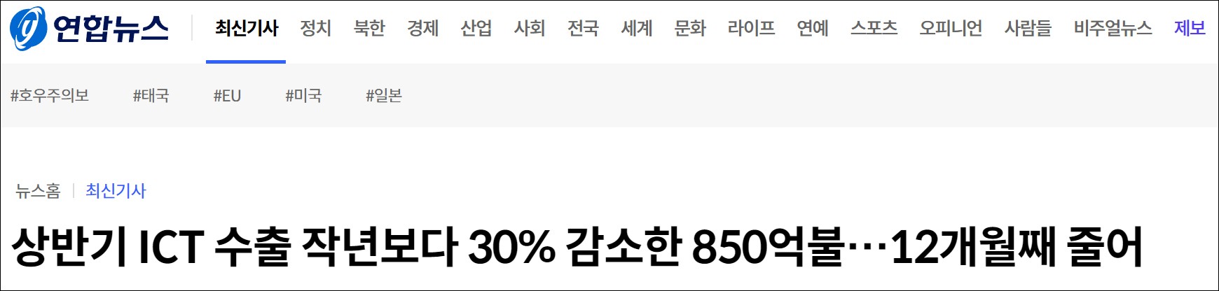 韓國ICT出口連降12個月!對華出口下滑36.5%香港新聞網7月14日電 當地時間7月13日,韓國科學技術信息通信部發佈的《信息通信技術進出口動向》報告顯示,韓國信息通信技術(ICT)產品出口額已連降12個月,今年6月的出口額也較去年同期下滑超22%。從出口目的地看,今年1-6月,韓國對最大市場中國的出口額減少了36.5%,對美出口下滑31.2%,對歐盟出口下滑27%,對越、對日出口分別下滑22.8%、12.2%。