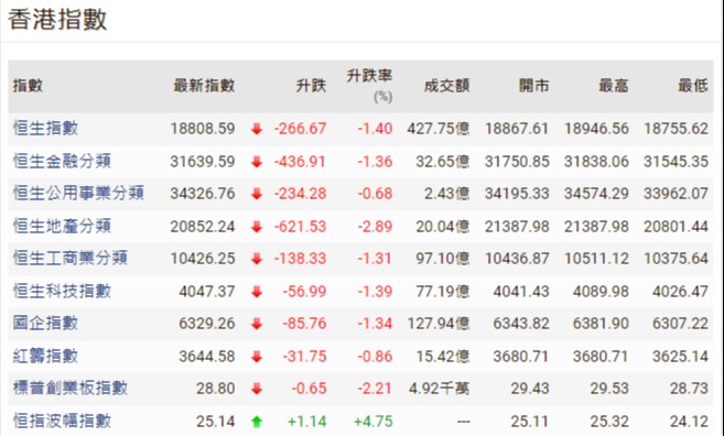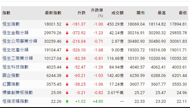 當天,恒指低開89點或0.5%,報17795點,其後跌幅擴大,跌154點,報17731點,創近一個月低位。惟跌勢持續再跌216點,報17668點,逼近8月22日之今年以來低位,即17573點。 恒生科技指數報3837點,跌84.73點或2.16%。國企指數報6096點,跌85點或1.38%。(完) 【編輯:崔靜雯】