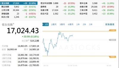 香港新聞網9月21日電 美國聯儲局議息後維持利率不變,但加強鷹派立場。21日中午,港股恆生指數收市報17651點,跌234點或1.31%,半天大市成交額為423.26億港元。