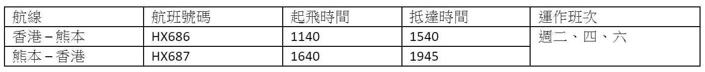 香港航空的日本熊本直航服務預計於12月2日正式開始運行。 熊本是香港航空在九州地區新增的第二個航點,將與現有每日往返福岡的航班互相結合,連接九州的北部和中部,為旅客提供更多元化的旅行選擇。 香港航空正積極擴大其在日本的服務,致力開拓更多航線以滿足旅客的出行需求;目前的日本航線網絡已覆蓋七大航點,除了熊本外,還包括每日往返名古屋、福岡的航班;每日兩班往返沖繩的航班;每日三班往返東京(成田)、大阪的航班,以及每週三班往返札幌的航班。 香港航空來往香港和熊本的航班詳情如下(所有時間均為當地時間):