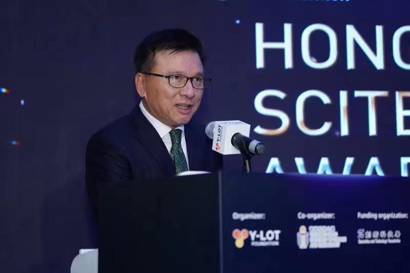 前財經事務及庫務局局長陳家強感謝 Y-LOT Foundation 舉辦是次頒獎典禮,他表示香港在粵港澳大灣區的定位是發展成國際創科中心,在港培育更多人才及讓更多有潛力項目萌芽,有利香港與大灣區和國際產生協同效應。