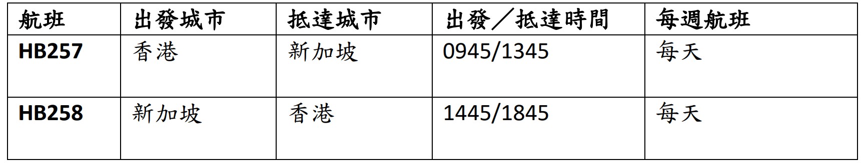 大灣區航空將於4月26日開辦新加坡航線。 新加坡全年舉辦各式各樣的文化娛樂活動,加上旅遊景點不斷推陳出新,成為亞洲區甚受歡迎的旅遊目的地。新加坡亦是一個國際大都會,是區內舉辦會議、獎勵旅遊及展覽,以及舉行各類商業活動的理想地點之一。一直以來,香港與新加坡兩地往來頻繁。 此外,中國與新加坡最近宣布實施30日互免簽證安排,預期來往中國內地(包括大灣區)與新加坡的訪客人數將進一步上升。 大灣區航空的香港—新加坡航班詳情如下: